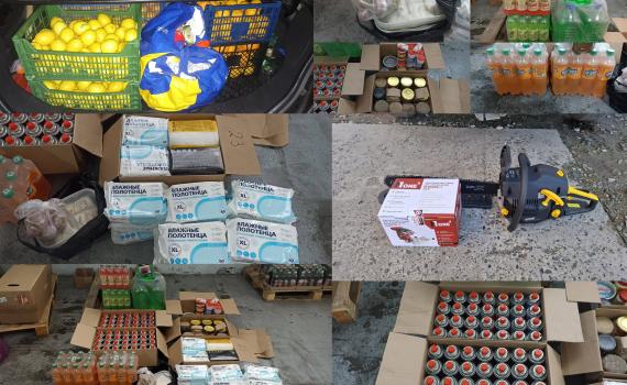 продукты питания (сало, чеснок, вода, различные консервы, ящики с фруктами)